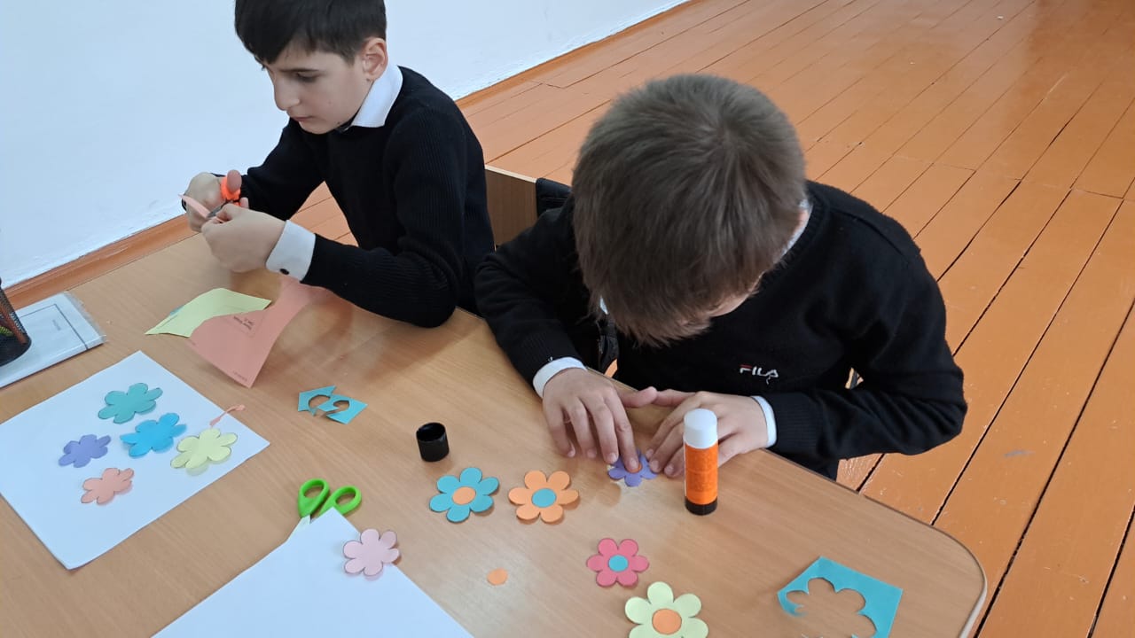 Каждый из ребят выбрал листы цветной бумаги, из которой они должны были вырезать цветы для себя и своих друзей, потом обменяться разными цветами и создать на листе белой бумаги свой разноцветный букет.
